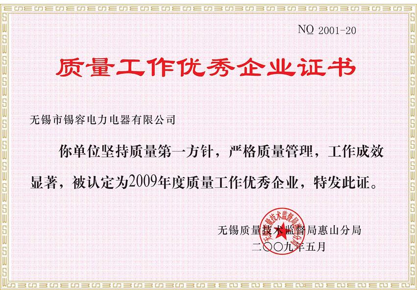質(zhì)量工作優(yōu)秀企業(yè)證書